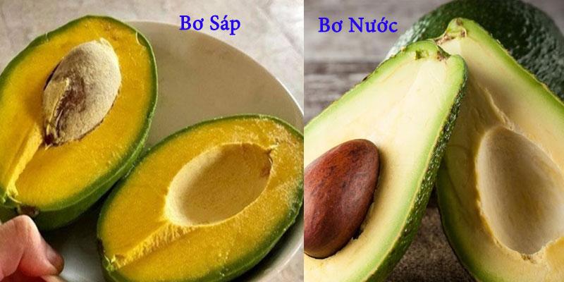 Bơ sáp sẽ có phần thịt màu vàng đậm, màu càng vàng thì thịt càng dẻo. Khi ăn vào bạn sẽ cảm nhận ngay được vị ngon, béo ngậy và thơm mùi bơ. Phần thịt bên trong của bơ nước màu vàng nhạt như mỡ gà, cho vào miệng có cảm giác như nước đang bắn ra, vị nhạt nhẽo và không béo bằng bơ sáp.