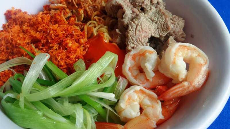 Bạn cho mì vào tô đổ phần muối ớt vào. Sau đó xếp tôm, thịt bò, trứng, hành lá lên trên, xịt tương ớt và vắt thêm trái chanh vào trộn đều lên là có ta có thể thưởng thức.