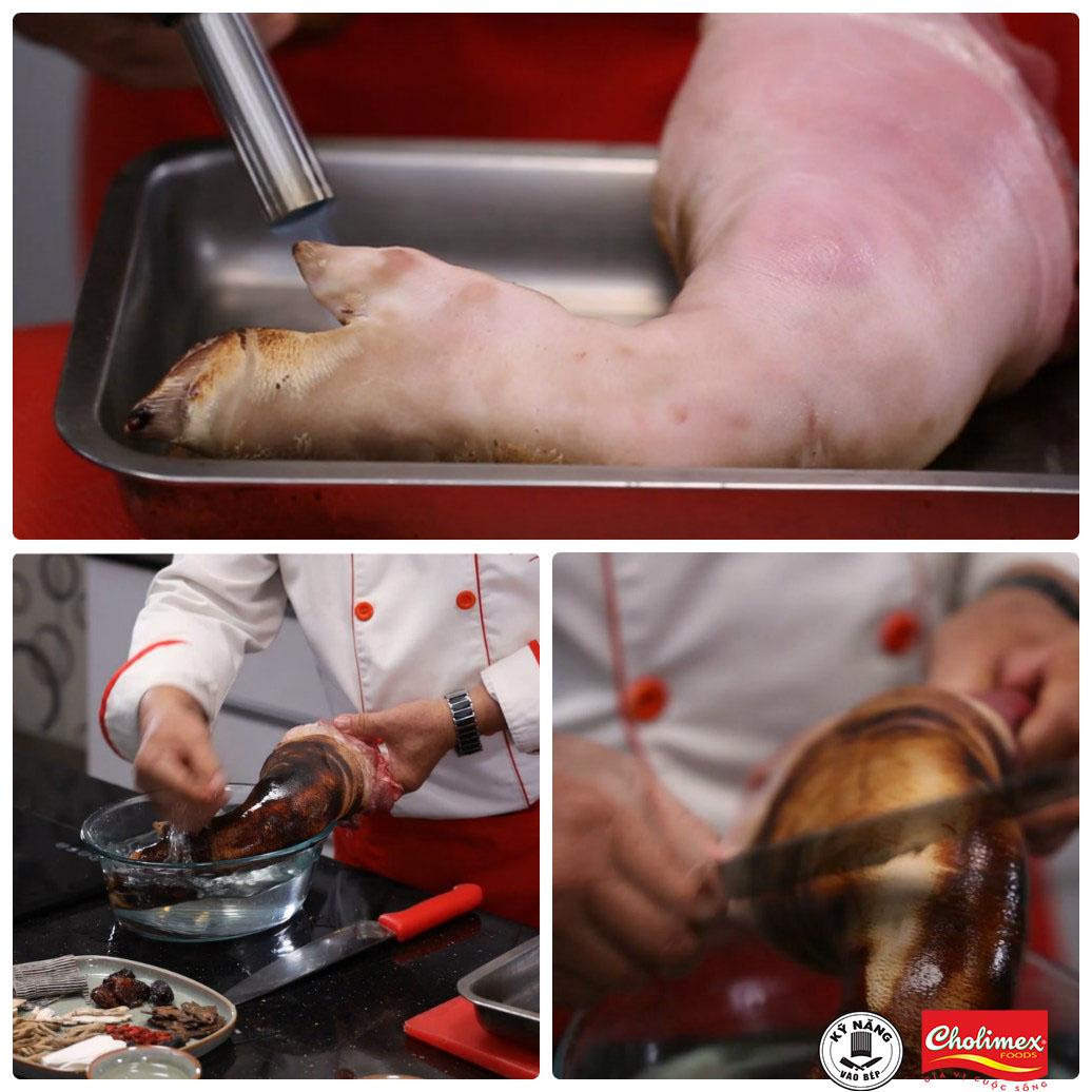 Bạn dùng dao rạch da giò heo từ trên xuống dưới, róc lấy phần xương. Với cách róc xương thế này sẽ giúp giò heo nhanh mềm, chín đều hơn. Sau đó, bạn dùng cọ quét lên giò heo một lớp hắc xì dầu đặc biệt, chú ý là quét đều hai bên.