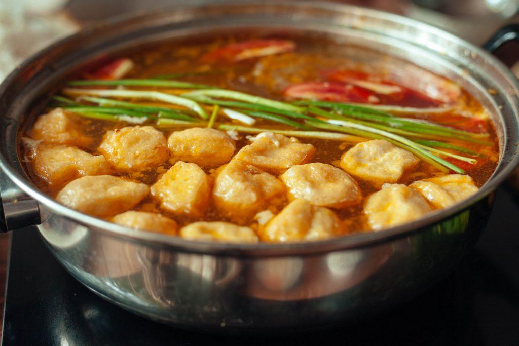 Rưới gạch cua và cà chua xào ở bước 6 lên trên. Thả vào nồi đậu phụ rán giòn và hành lá xanh cho đẹp mắt. Đun sôi nồi lẩu và nhúng thôi!